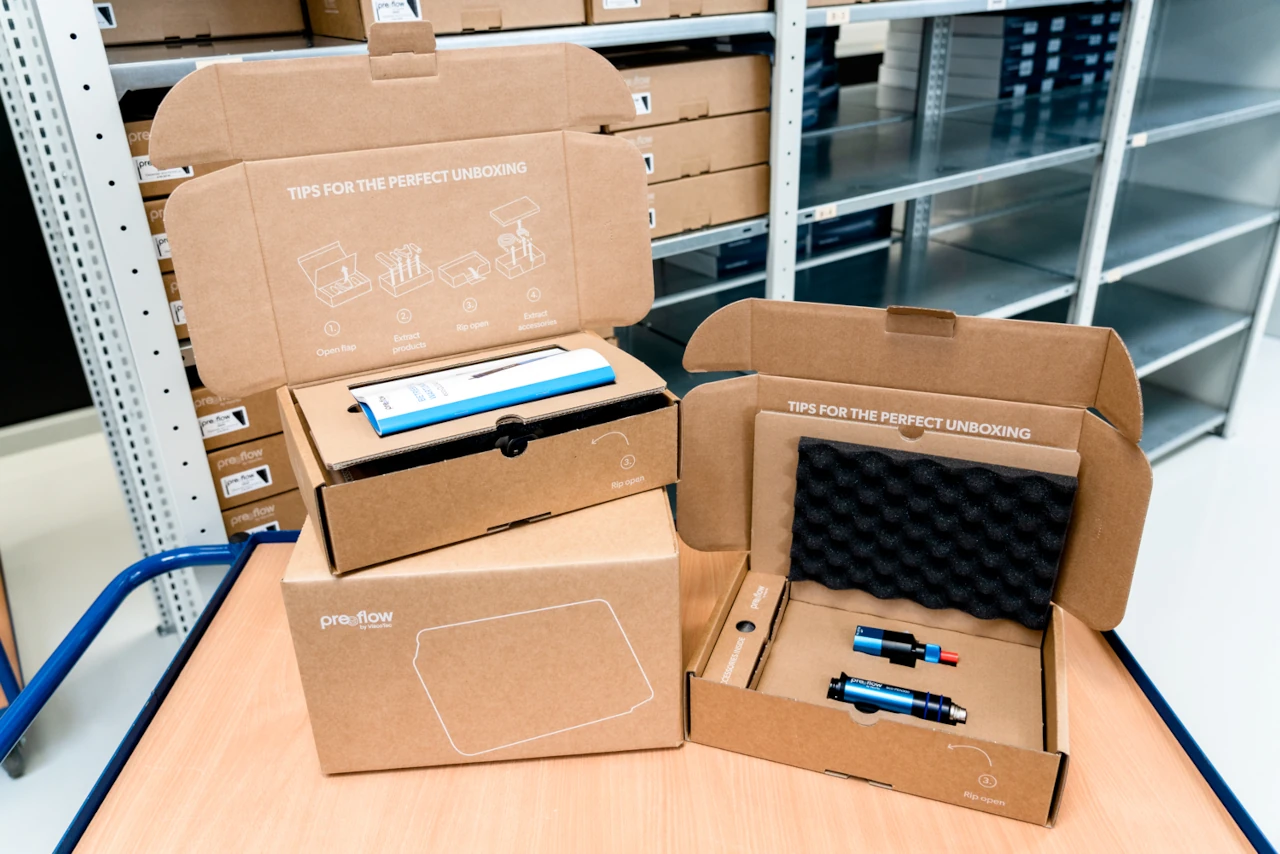 If you want to see the results of the preeflow® efforts at ViscoTec, you do not have to look far: There are currently around 20,000 sustainably produced outer cartons in the warehouse. Manufactured by a regional partner from Bavaria, they will protect sensitive dispensing technologies such as the eco-PEN or eco-DUO in the future. There are also new cardboard boxes for control units and evaluation devices that meet the sustainability criteria.